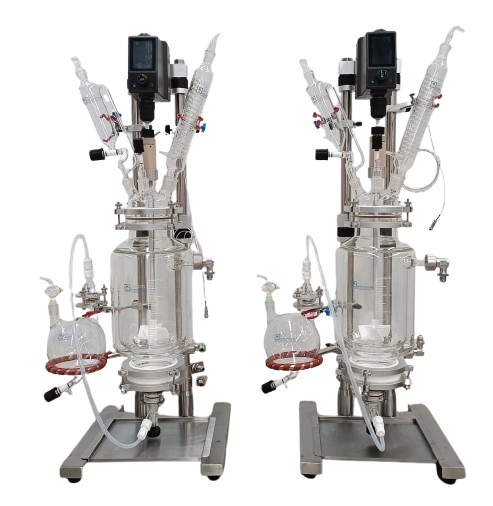 Introducing the Ai R-series single glass reactors bench top reactors. Both the 2L and 5L reactor vessels can be used on the same frame, allowing for greater flexibility and customizability. Reactors are designed for synthetic reaction of different types of materials in a controlled temperature and vacuum environment. Each reactor features adjustable stirring speeds and a constant pressure feeding funnel that allows you to add material to the vessel at a uniform and controlled speed. The built-in condenser makes it possible to recover some materials, also at a controlled rate of speed.